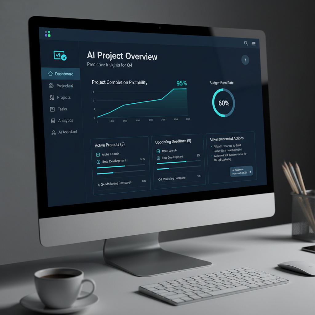 Ekran komputera prezentujący dashboard AI do zarządzania projektami