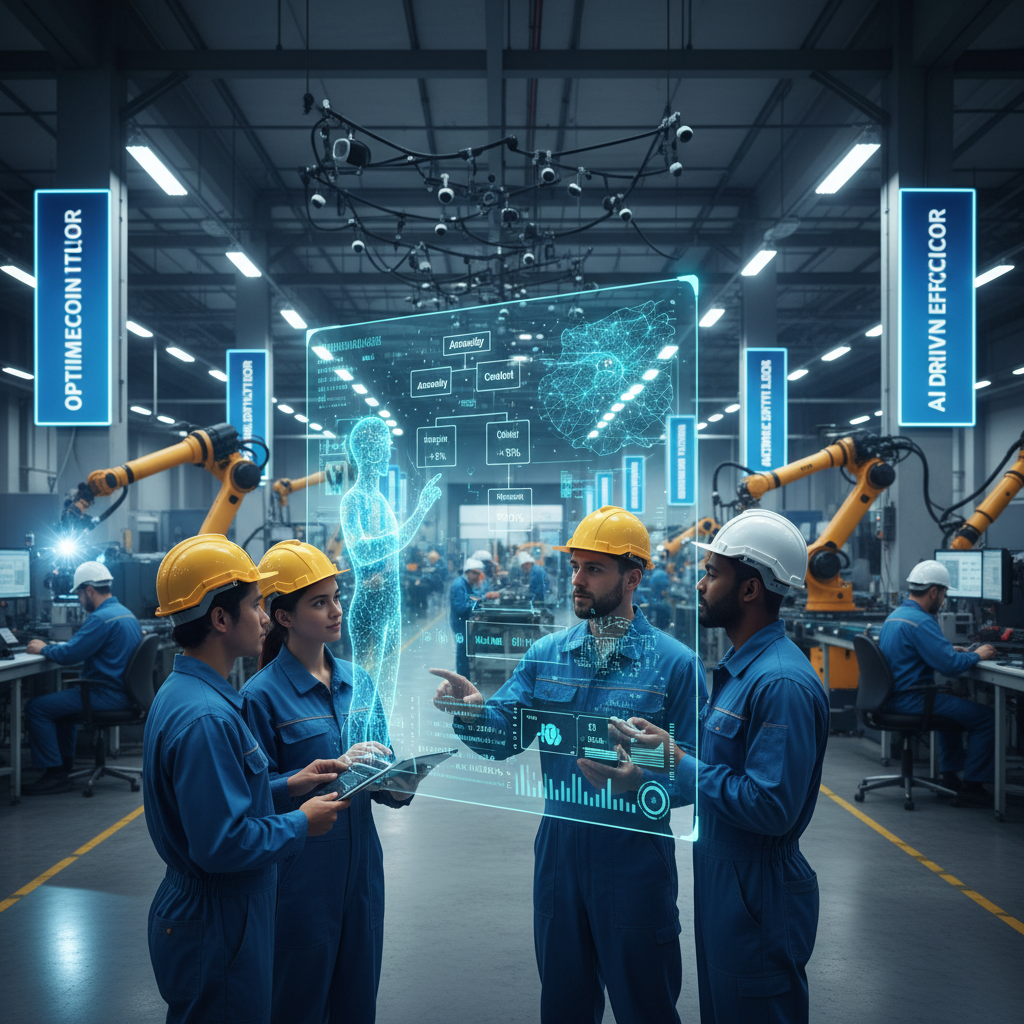 Pracownicy produkcyjni korzystający z aplikacji AI do optymalizacji procesów