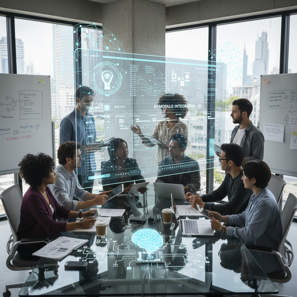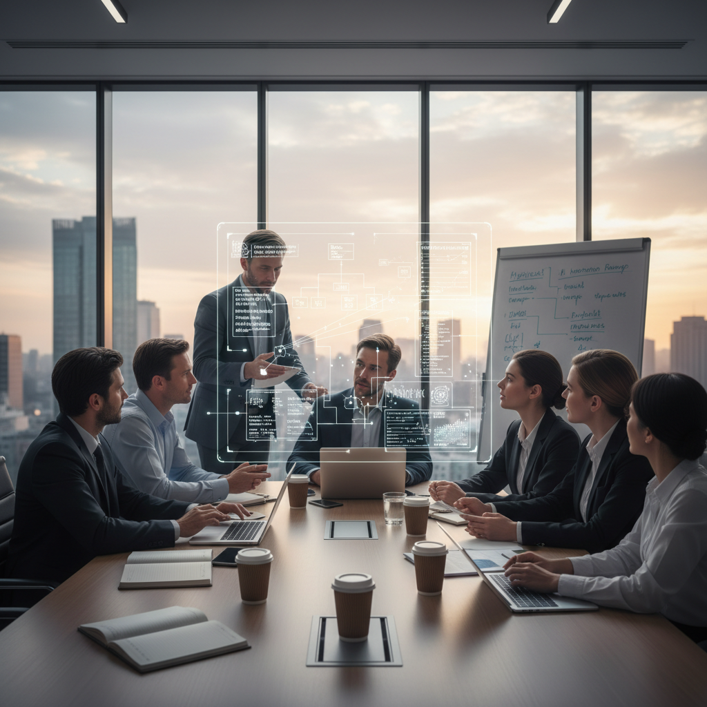 Nowoczesne biuro, gdzie zespół żywo debatuje nad wdrożeniem aplikacji AI do monitorowania projektów