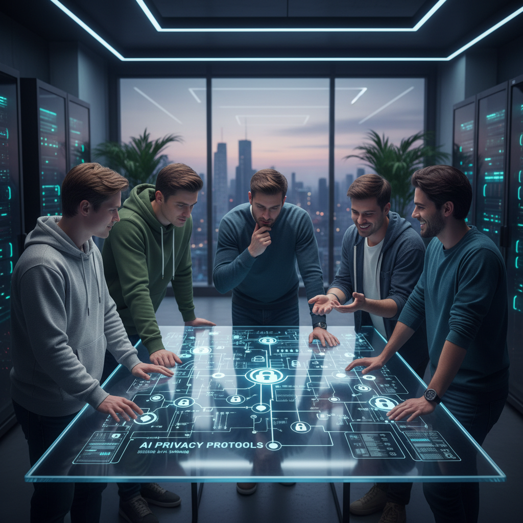 Na zdjęciu widoczny zespół programistów pracujących nad kodem aplikacji AI dbającej o prywatność użytkowników.