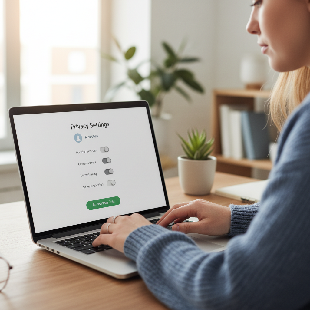 Zdjęcie pokazuje użytkownika przeglądającego ustawienia prywatności aplikacji na laptopie.