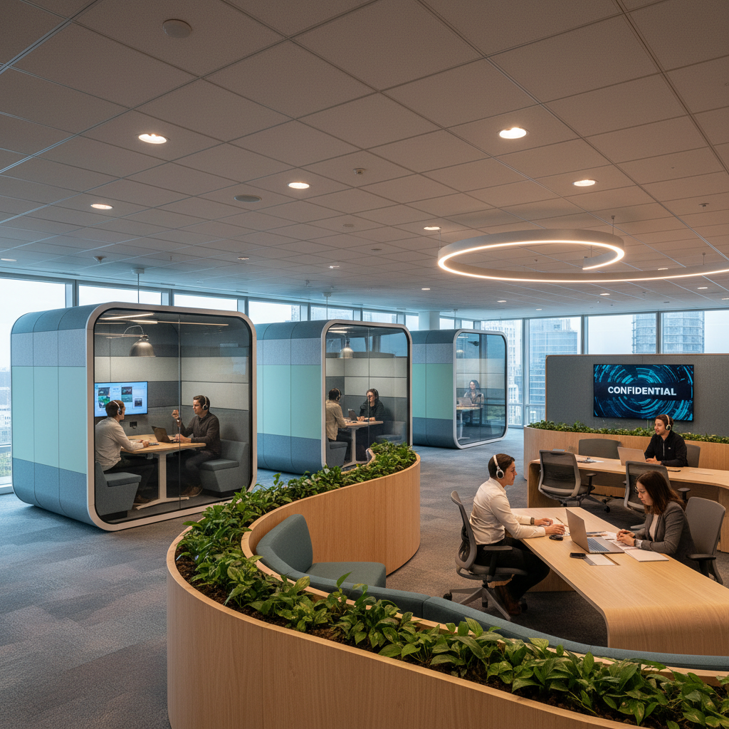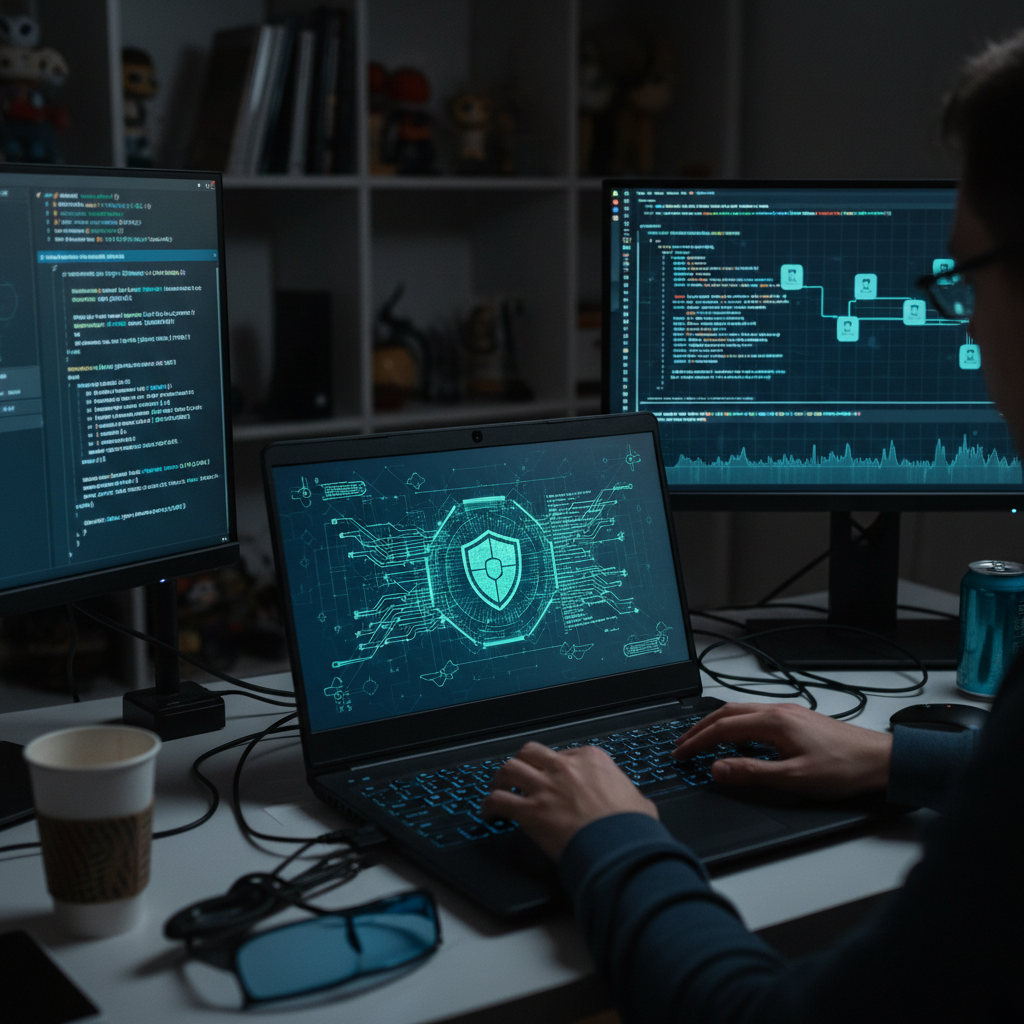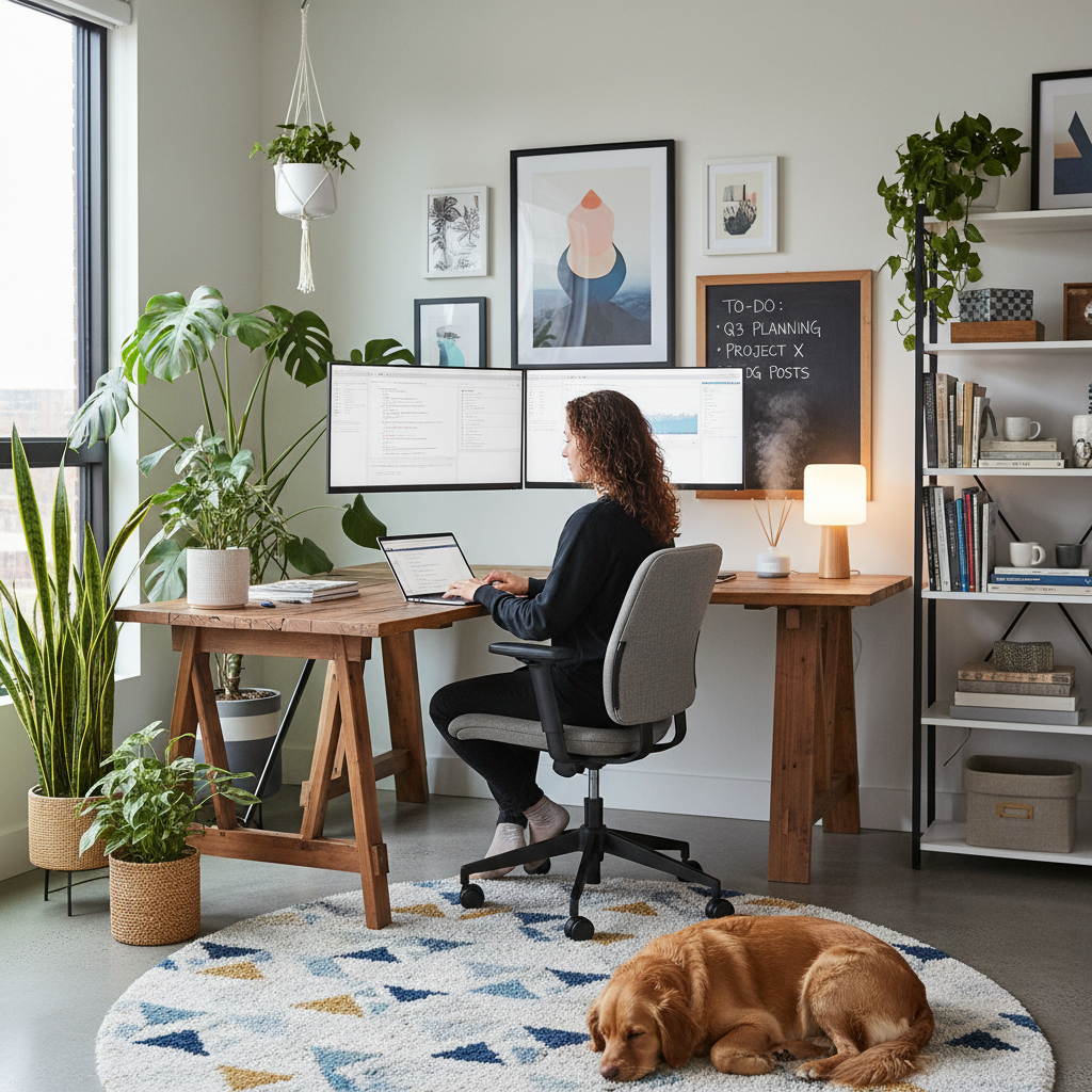 Użytkownik korzysta z osobistego asystenta AI dbającego o prywatność w nowoczesnym domowym biurze.