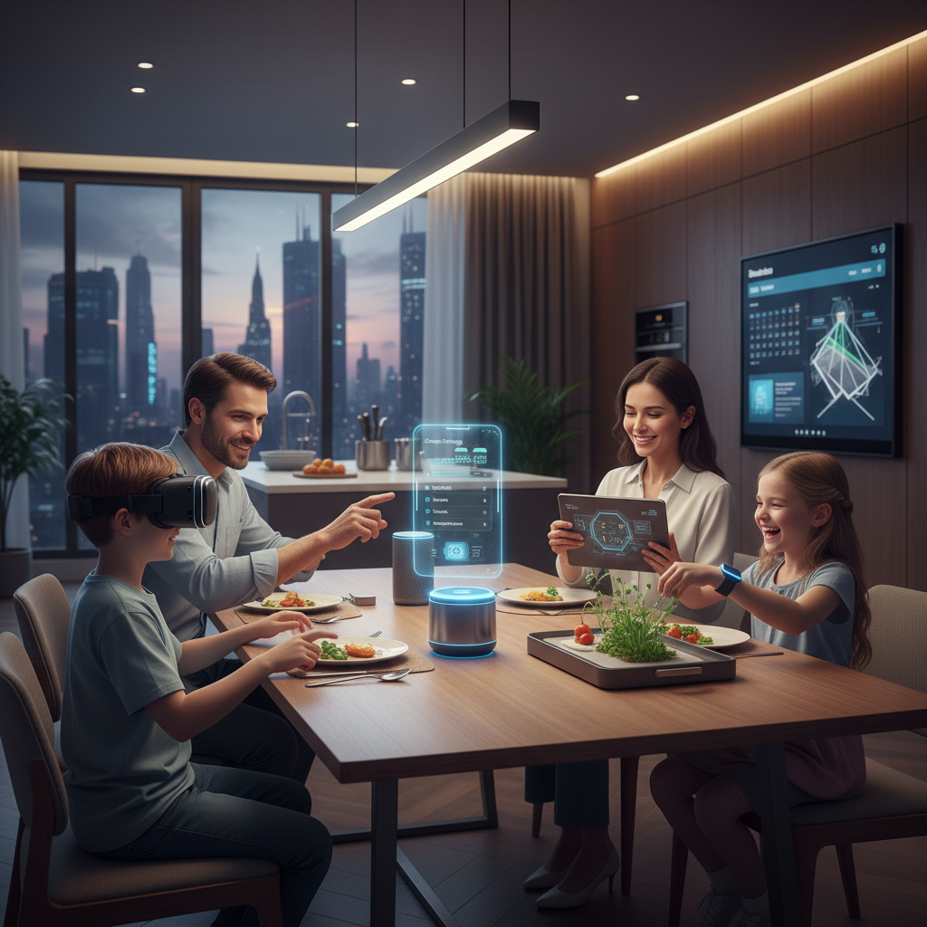 - IoT (Internet Rzeczy): Sieć połączonych urządzeń, które komunikują się ze sobą i użytkownikiem, tworząc „inteligentny dom”.